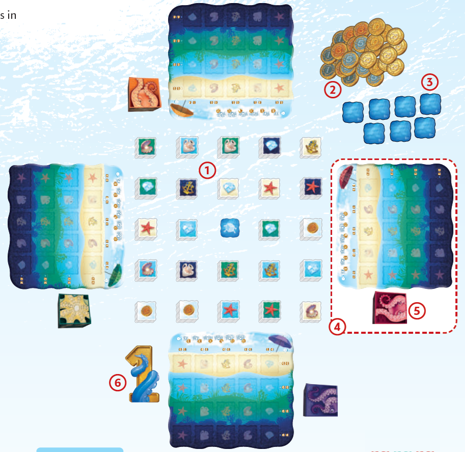 あなたの前のスペースはパーソナルエリア(4)と呼ばれ、プレイヤーボード(傘の面を上にして)と同じ色のタコキューブ(5)を置きます。ランダムに選ばれたファーストプレイヤーは、ファーストプレイヤートークン(6)もそこに保持します。