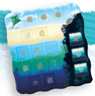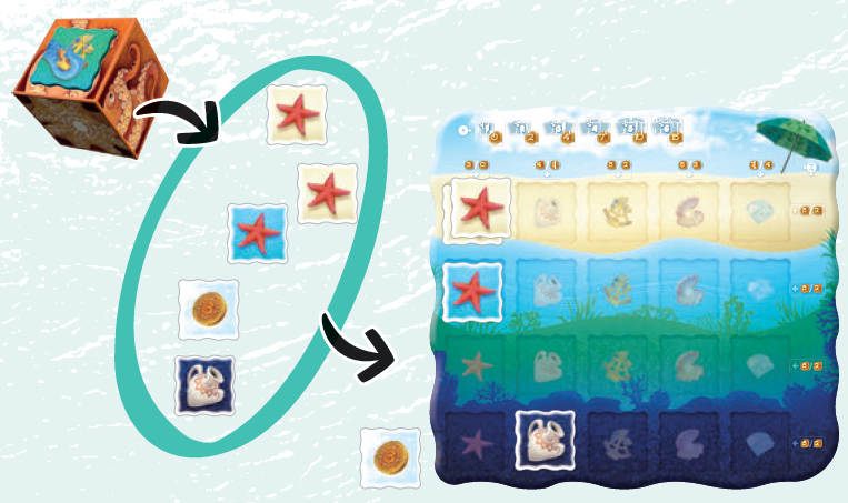 例: コインタイルを1枚集め、ボードの横に置きます。 また、ヒトデのタイルを3枚、アンフォラのタイルを1枚集めますが、パールタイルはキューブに残すことにしました。 3枚のヒトデタイルで4点、1枚のアンフォラタイルで0点を獲得し、これら4枚のオブジェクトタイルをプレイヤーボードに保管します。 パールタイルは後で収集することにしたため、キューブに付着したままにします。 |