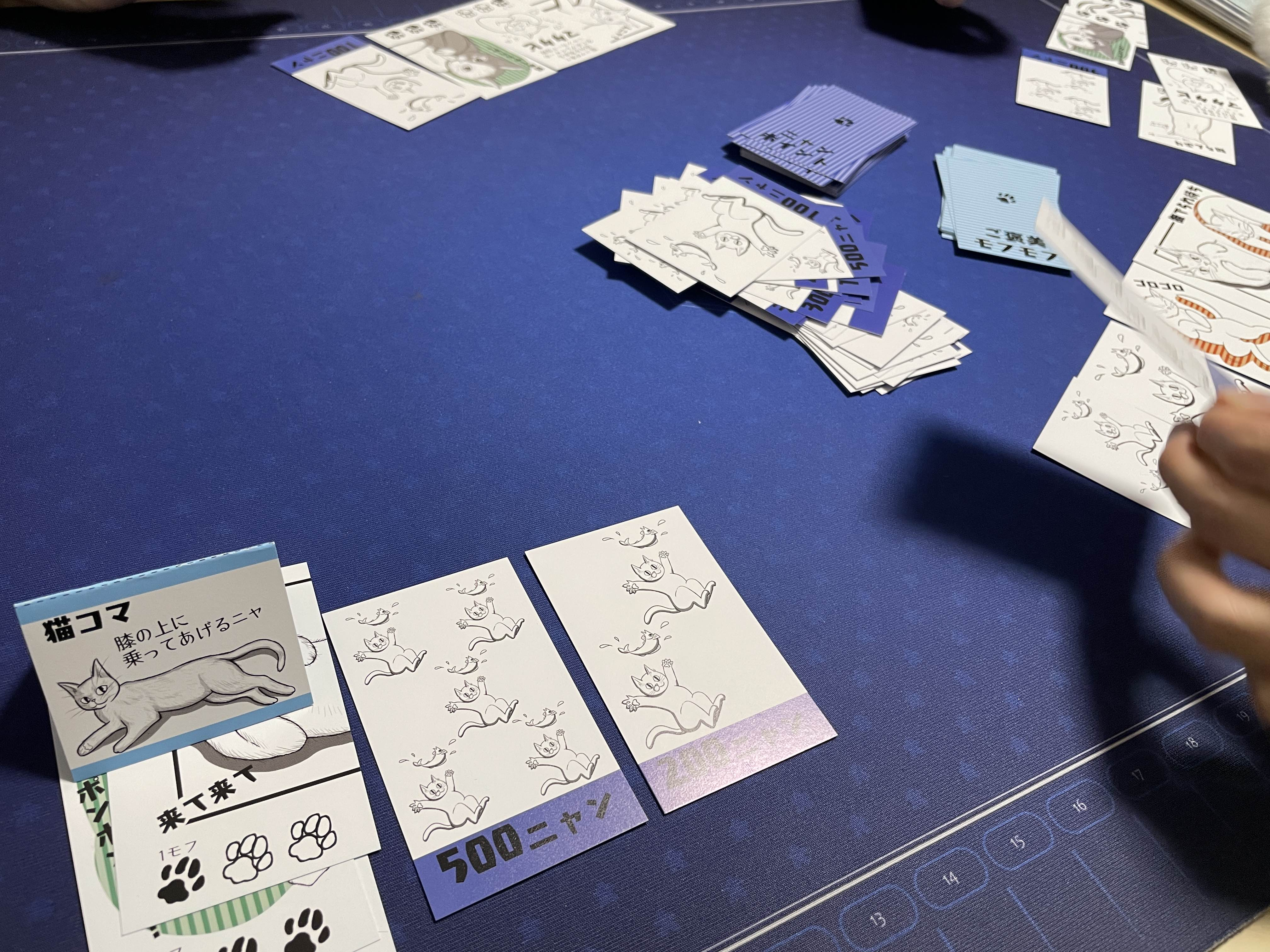 お金カード(ニャン)の山札、猫の山札(ネコカフェに来た感じ)を用意したらスタートです。
