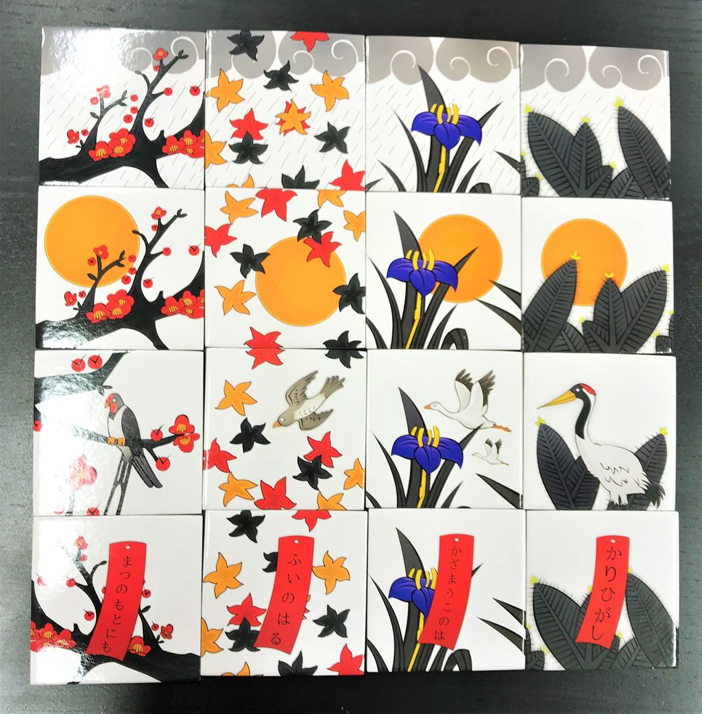 タイルを綺麗に並べると、こんな感じで4種類の植物がそれぞれ4種類の装飾になっています。花札風ですが、短冊の言葉が違いますし、ちょっとずついろいろ違うようです。