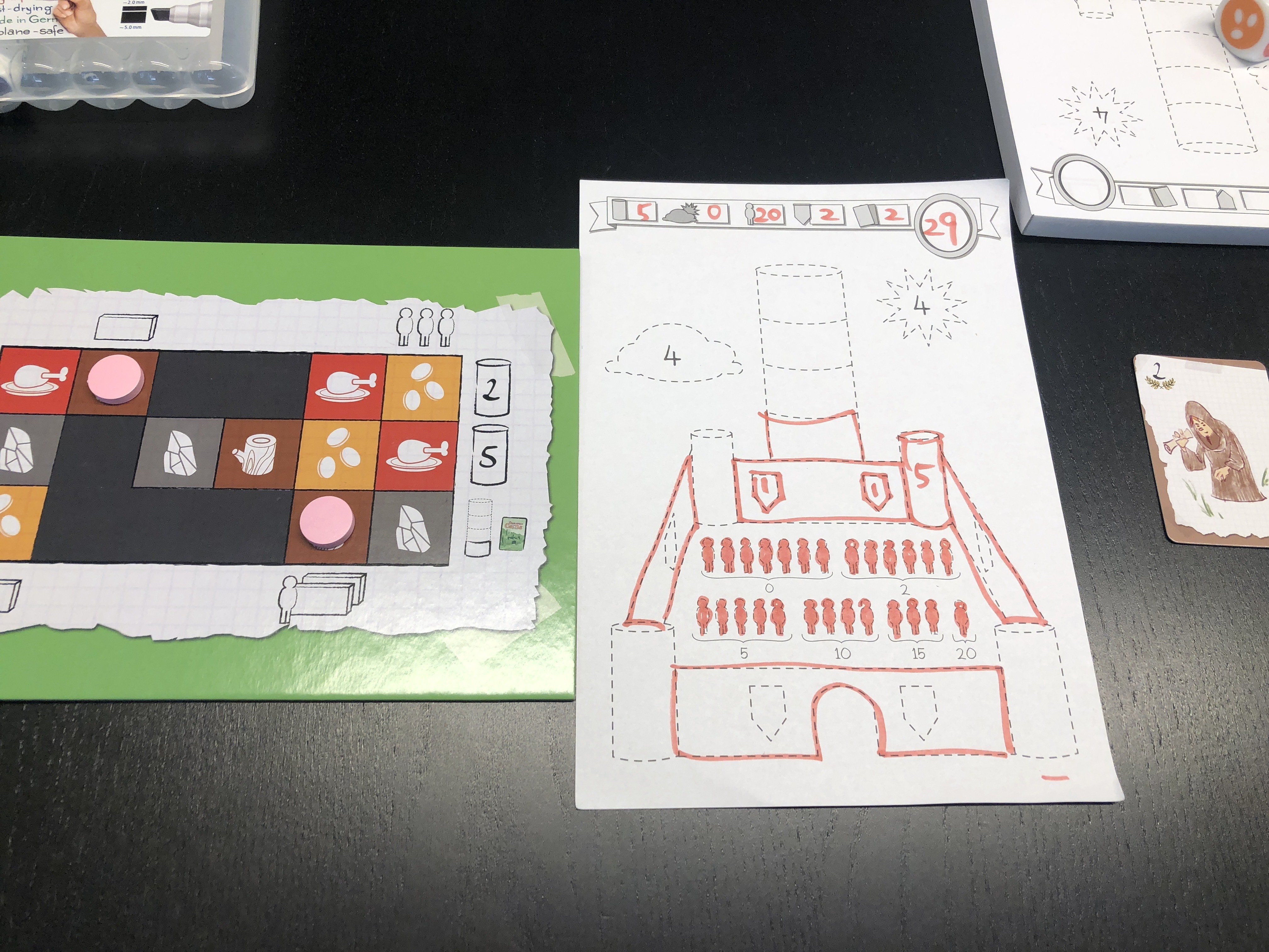 誰かが壁柱住居を描ききってしまうとゲームが終了ですが、それ以外はあまり競合する要素がなく、割とのびのび遊べました。さくっとやると10分くらいで1ゲーム終わります。