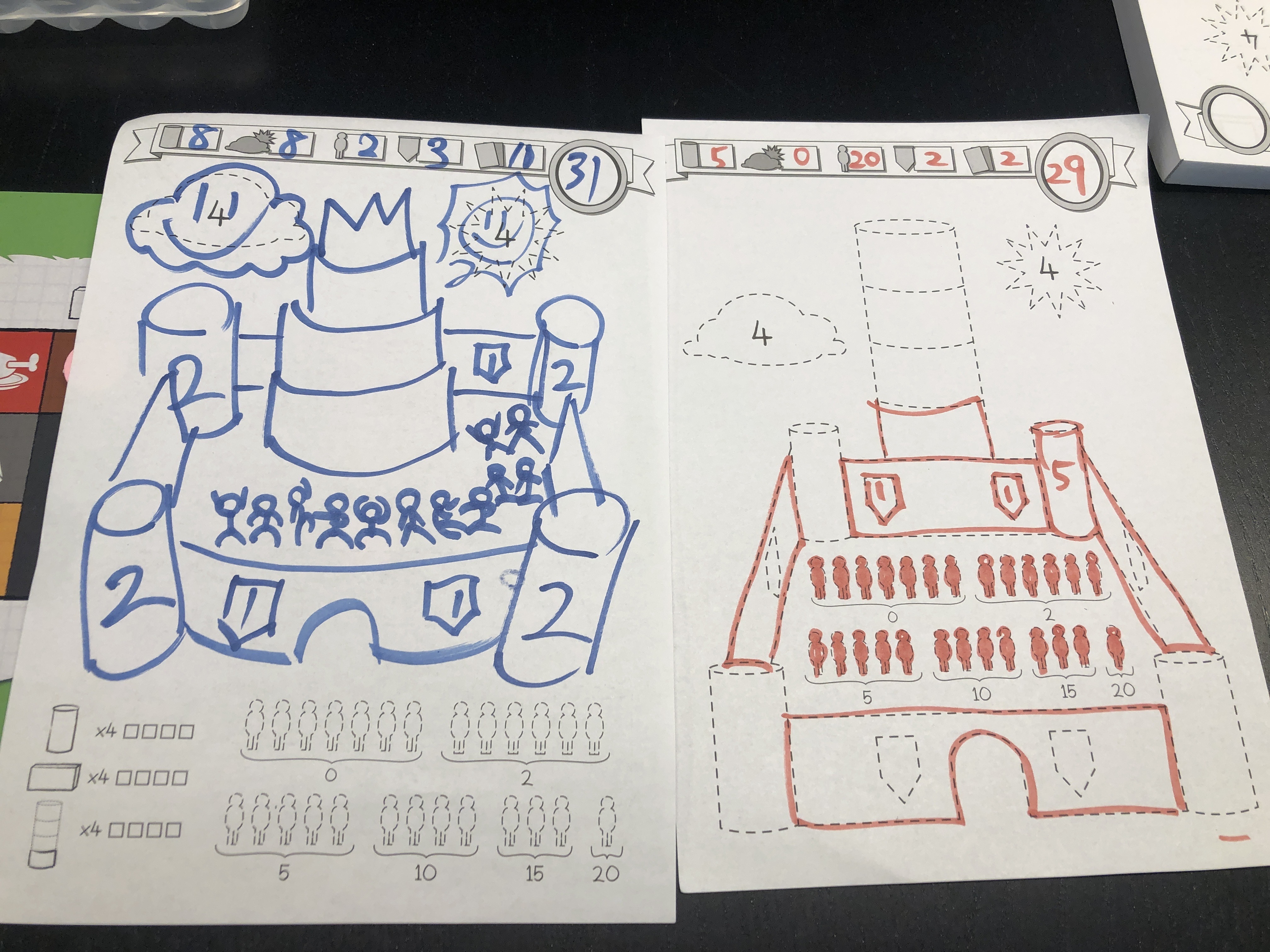城の要素が壁、柱、住居、人、旗とあってちょっとずつコストと得点の入り方が違うので、何が良さげか探りながら書いていく感じ。ただダイスを振って出た目を書くので運もある程度影響します!