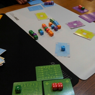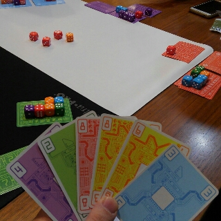 リードプレイヤーからカードをプレイして、その色のカードがありましたら必ず出します。出せないなら何色でも構いません。カードを出し終わったら、同じ色のダイスをカードに置いていき、フォローできてダイスの出目とカードの数字の合計が大きいプレイヤーが勝ちになります。