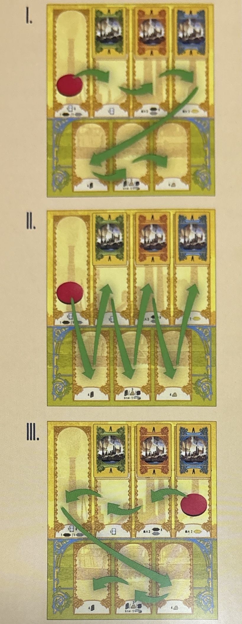 更に、建物効果が強力なものは、4種ある経路(小道、道路、線路、運河)のうち、特定の経路で建物を囲んだり、あらかじめ産業ボードに一定数以上の経路を敷設しておくなど、事前準備が必要なことが多い。