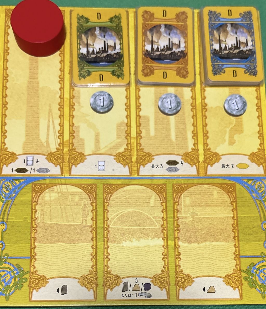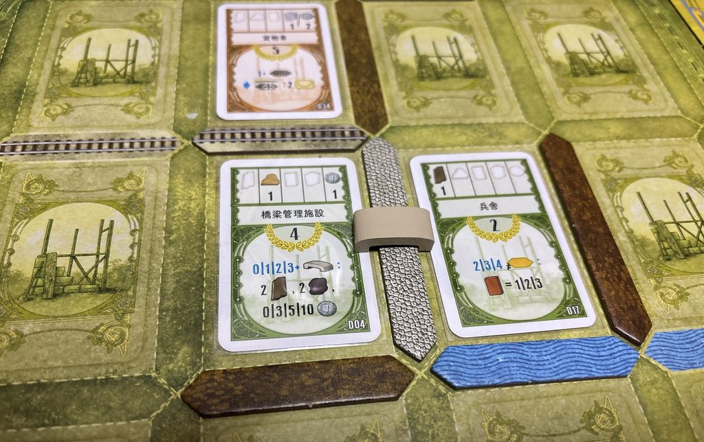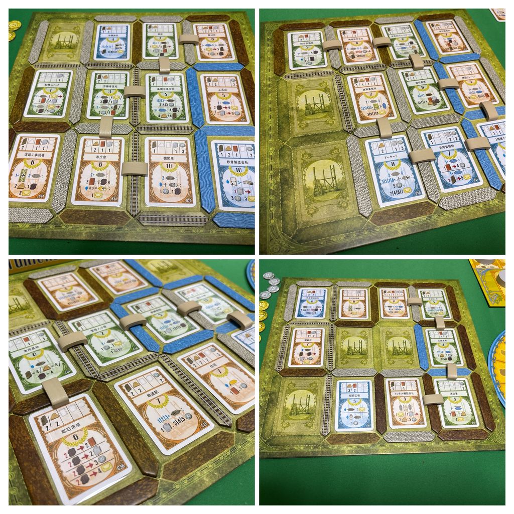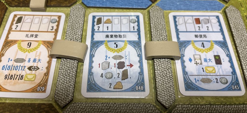 また、経路のうち線路や運河はどこでも好きなところに敷設できる訳ではなく、ボードに最初に印刷された(または上級面だと自分で置いた)線路や運河から徐々に延ばしていく必要があります。従って線路や運河に囲まれることで効果を発動するタイプの建物は、建て場所をどこにするかも重要ということになります。