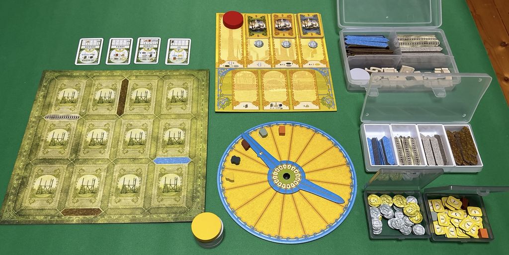 自分のボード(産業ボード)と資源ホイール、アクションボードを出し、小物(資源駒、アクションディスク等)を指定の場所に置いて、あとはその日遊ぶデッキを決めたら緑6枚、赤5枚、青7枚を抜き出してシャッフルし、所定の場所に置いて準備完了。箱から出して5分でもう遊べちゃう!