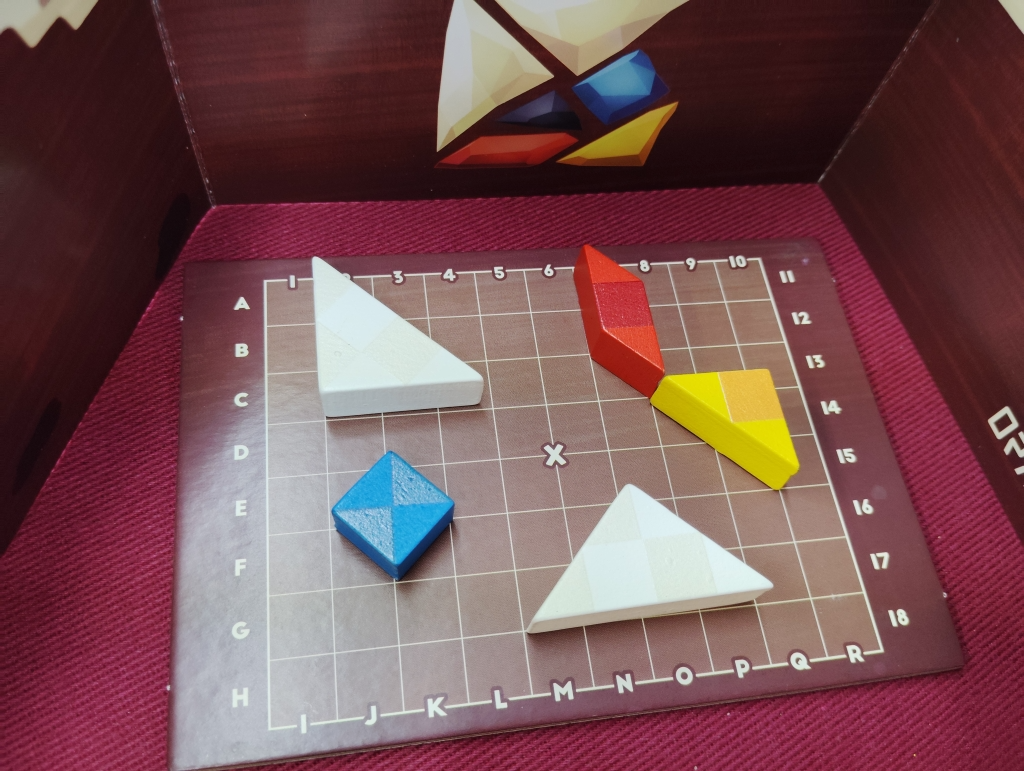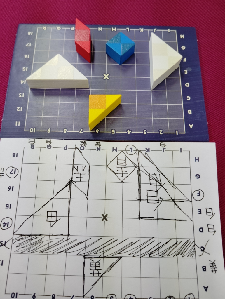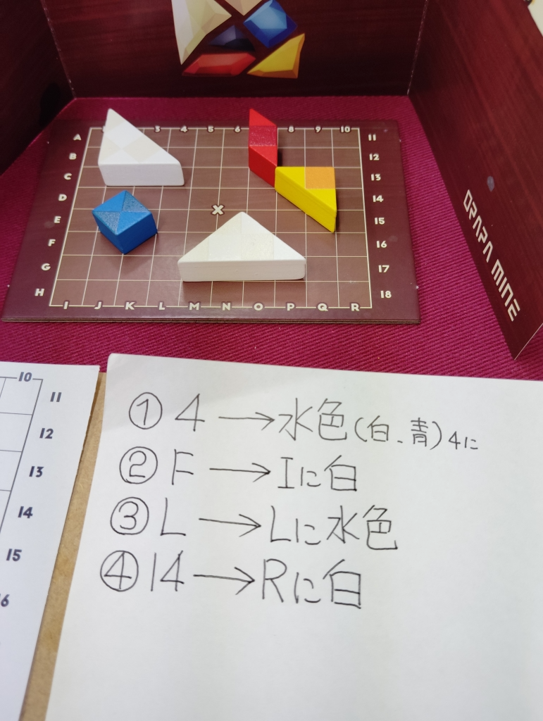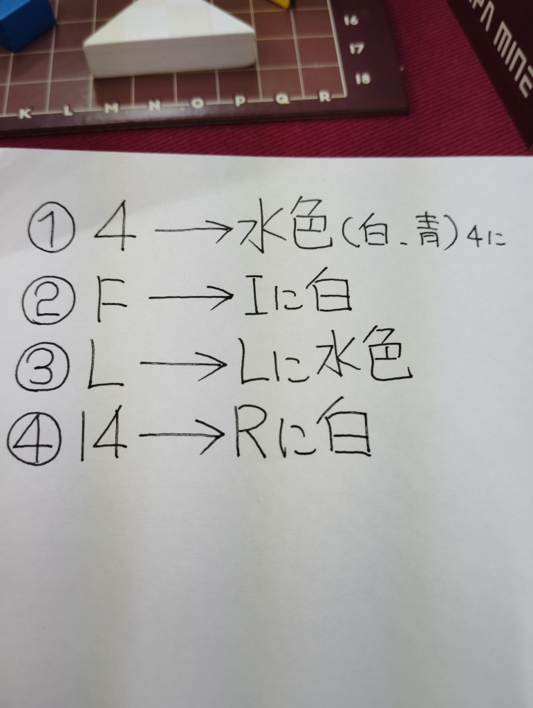 ゲーム開始時に白2個、赤1個、黃1個、青1個のブロックをA〜R、1〜18のマス目に配置します(自分の配置は一部間違いあります)。