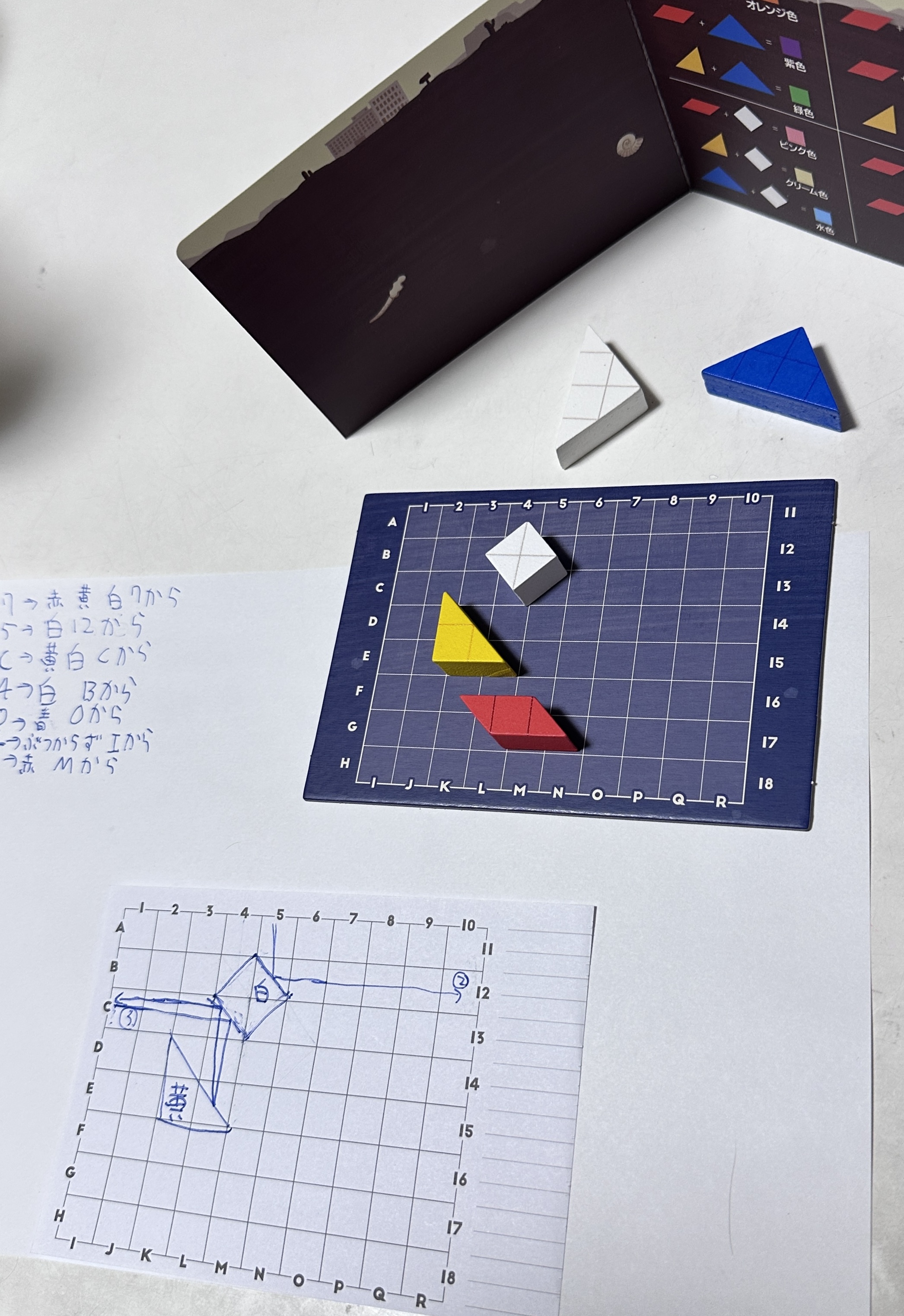 ということで、今回は3人プレイだったので、出題者があらかじめブロックの位置をメモ用紙に書いておき、その後、2組のブロックを回答者それぞれに渡して使ってもらうことにしました。その方が遊びやすい。やはり人数分のブロックが欲しい。
