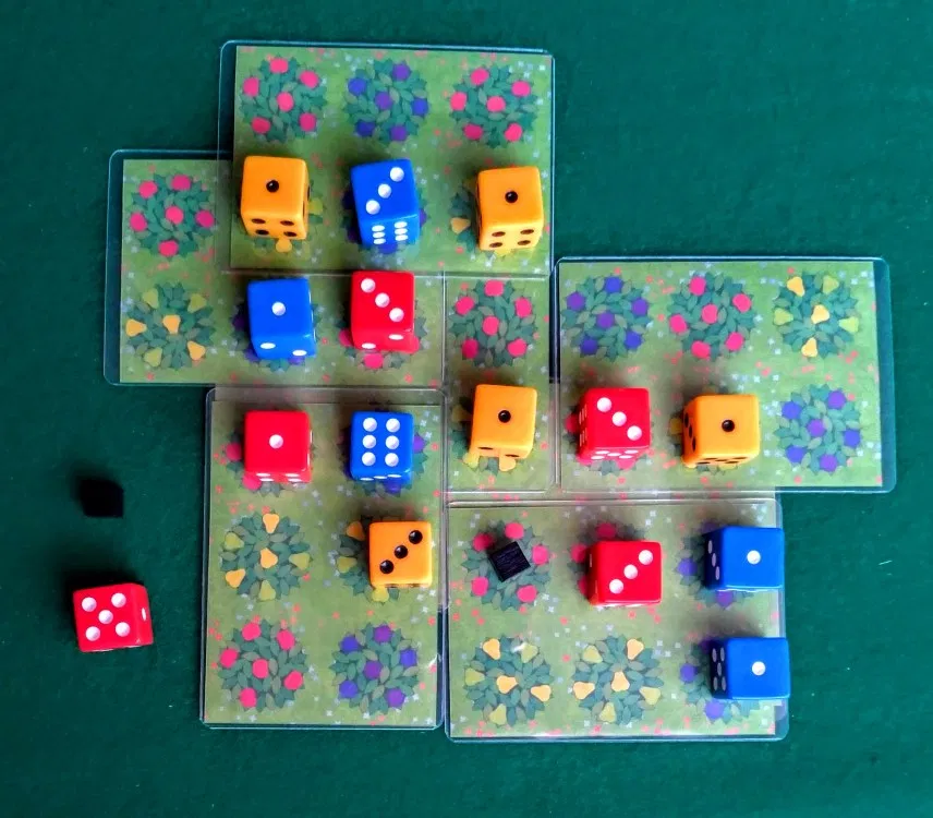 カード数は少ない(カード9枚までというレギュレーションのコンテスト出品作でもあるので)のだけど、ダイス3色を5個ずつ用意するというのがなかなかハードルが高い。
