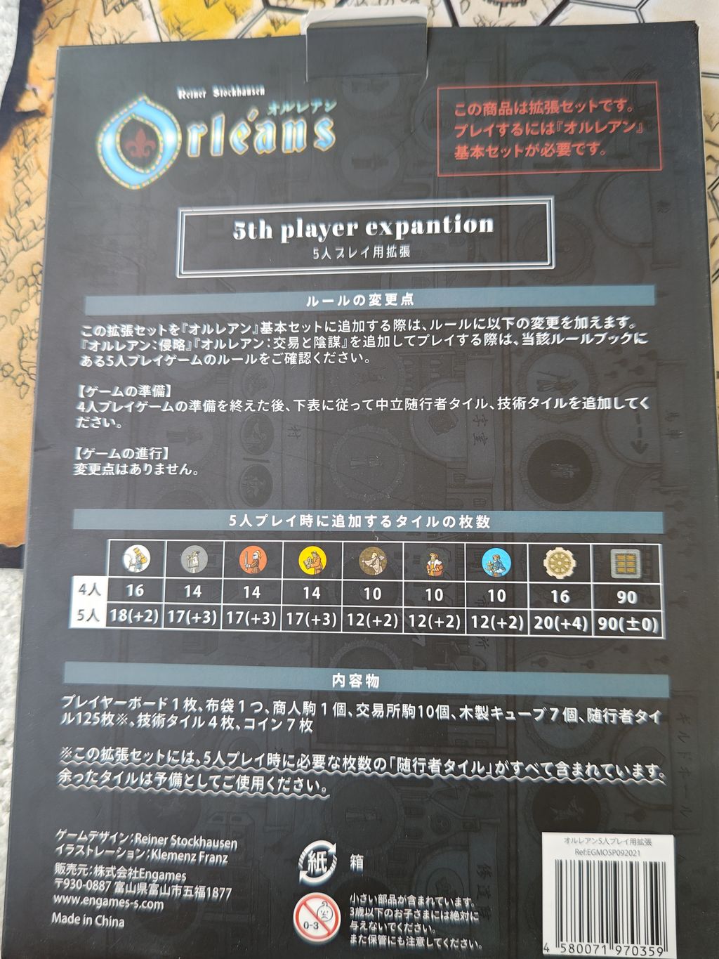 ・オルレアンが5人でやれます。5人拡張は冗長になりやすいけどカタンみたいにならず同じサクサク感で遊べてさすが!