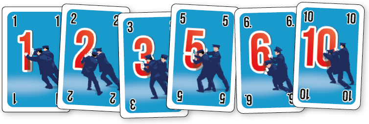 5!7!17!20! 次のプレイヤーは1を持っていません。したがって、合計が21を超えるため、カードを置くことはできません。3を置いたプレイヤーは、5、2、10、3の4枚のカードを取り、裏向きにして自分の前に置きます。 |