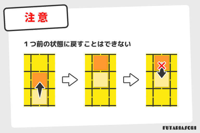 ※相手のコマが複数並んでいた場合も、1マスずつ押し出すことができる。※1つ前の状態に戻るよう動かすことはできない。