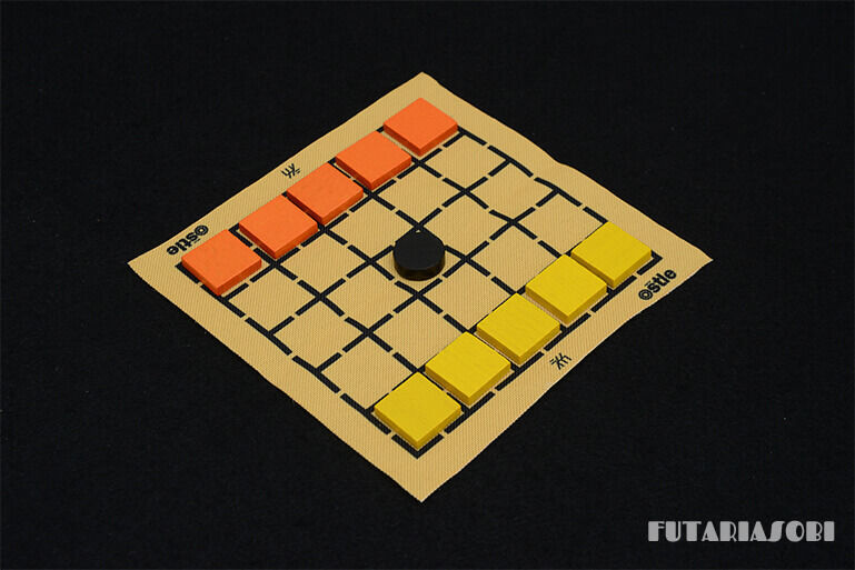 | 布製ゲームボード / 黄コマ 5個 / オレンジコマ 5個 / 穴コマ 1個 / 説明書 2枚 |