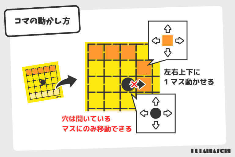 - 自分のコマか穴コマを上下左右に1マス動かす。