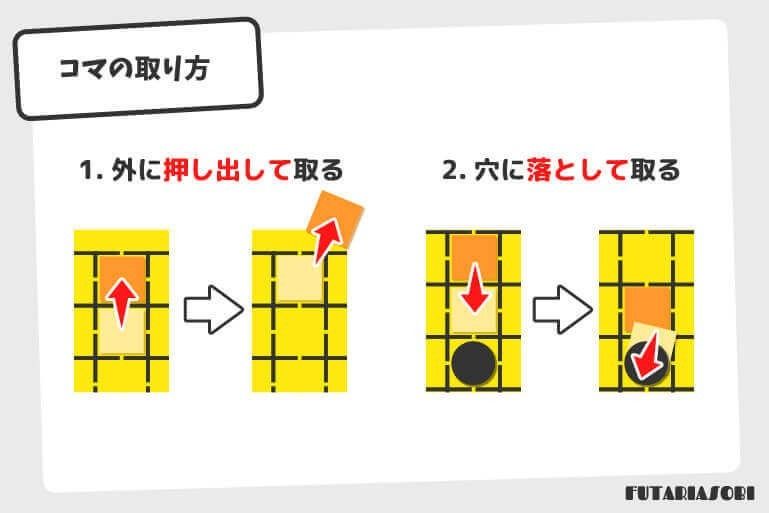 ボードから相手のコマを押し出すか、穴コマへ落とすことで1個取ることができる。