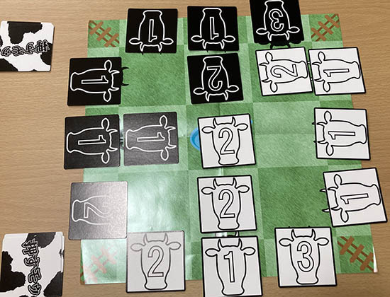 2人用のゲームで、3×3マスのボードに、端から自分の色の牛カードを入れていく。