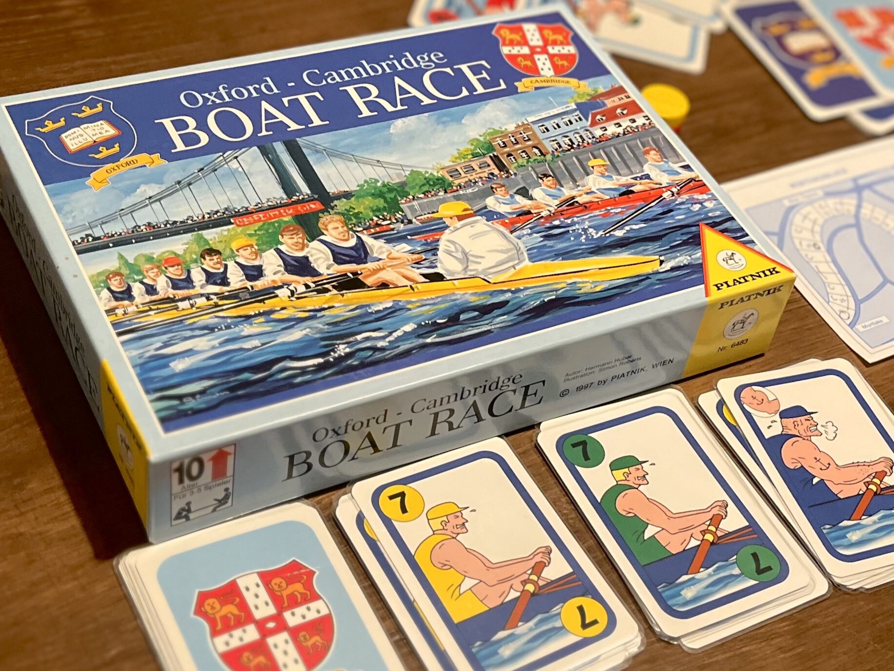 パズルかな?と思わせる箱の中には期待以上に興味深いトリックテイキングが入っている。イギリス名門大学のボートレースをテーマにしたピアトニク社の古い作品で結構面白い。ボートを漕ぐおじさんやカード背面のゆるめタッチのエンブレムも良い感じだ。