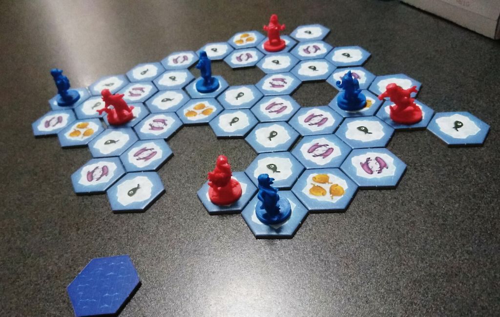 2人だと動かすコマが4つなので、よく考えてまんべんなく動かさないと墓穴掘ります。また、コマの多さ故自分だけの漁場を作ろうとしても相手の動かし方次第で最低限の魚しかない漁場になったり、孤立させられて詰みます。3匹の魚タイルをどれだけ取れるかが勝利のカギですね。