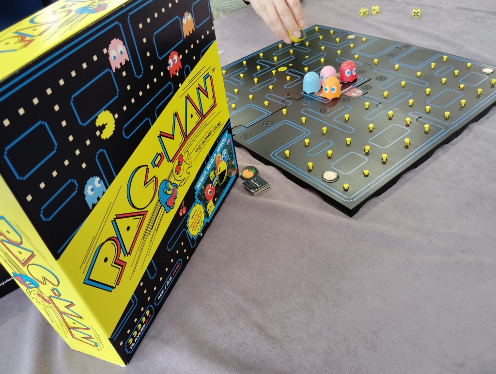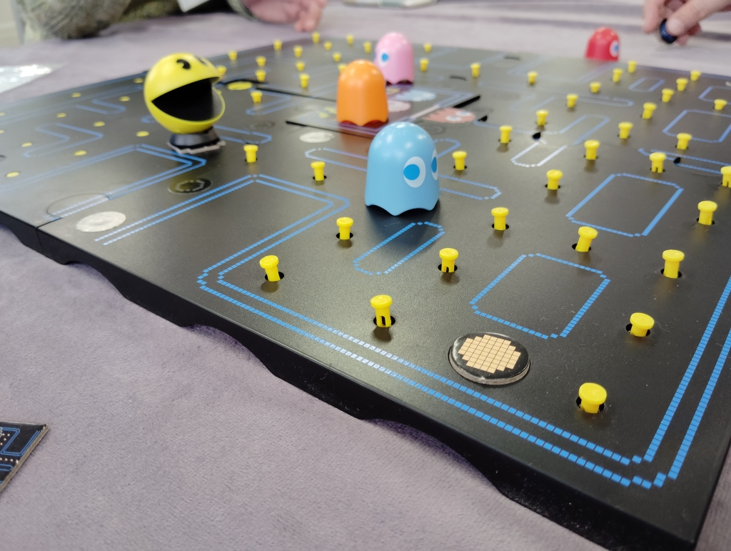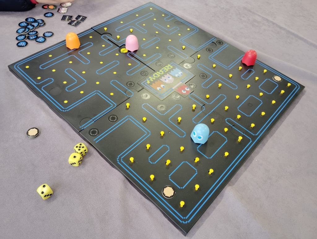 パックマンのゲームを再現したボードゲームで、1人1回パックマンになりゲームでお馴染みの黄色玉をオバケ?を避けつつ食べていきます。