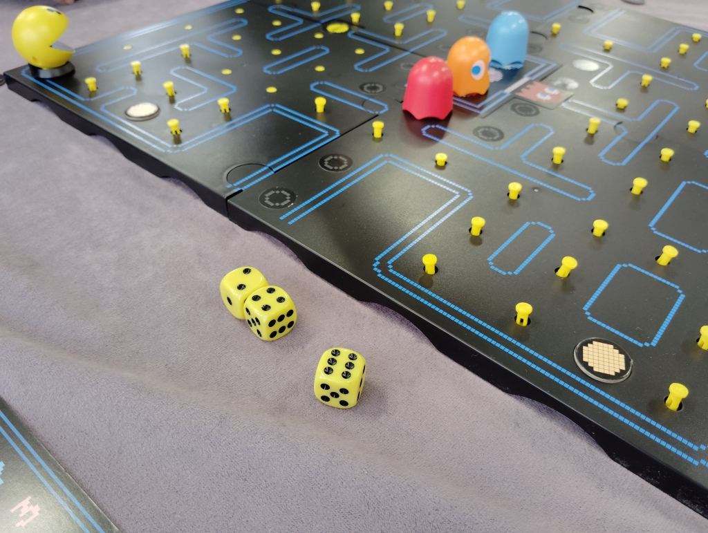 ダイスを3個振って出目合計分だけパックマンは動けますが、スーパーパクパクモードの時はダイスを1個ずつ振るのでパクってした後にオバケが復活してからの移動で逆襲されるプレイヤーが続出でしたね。