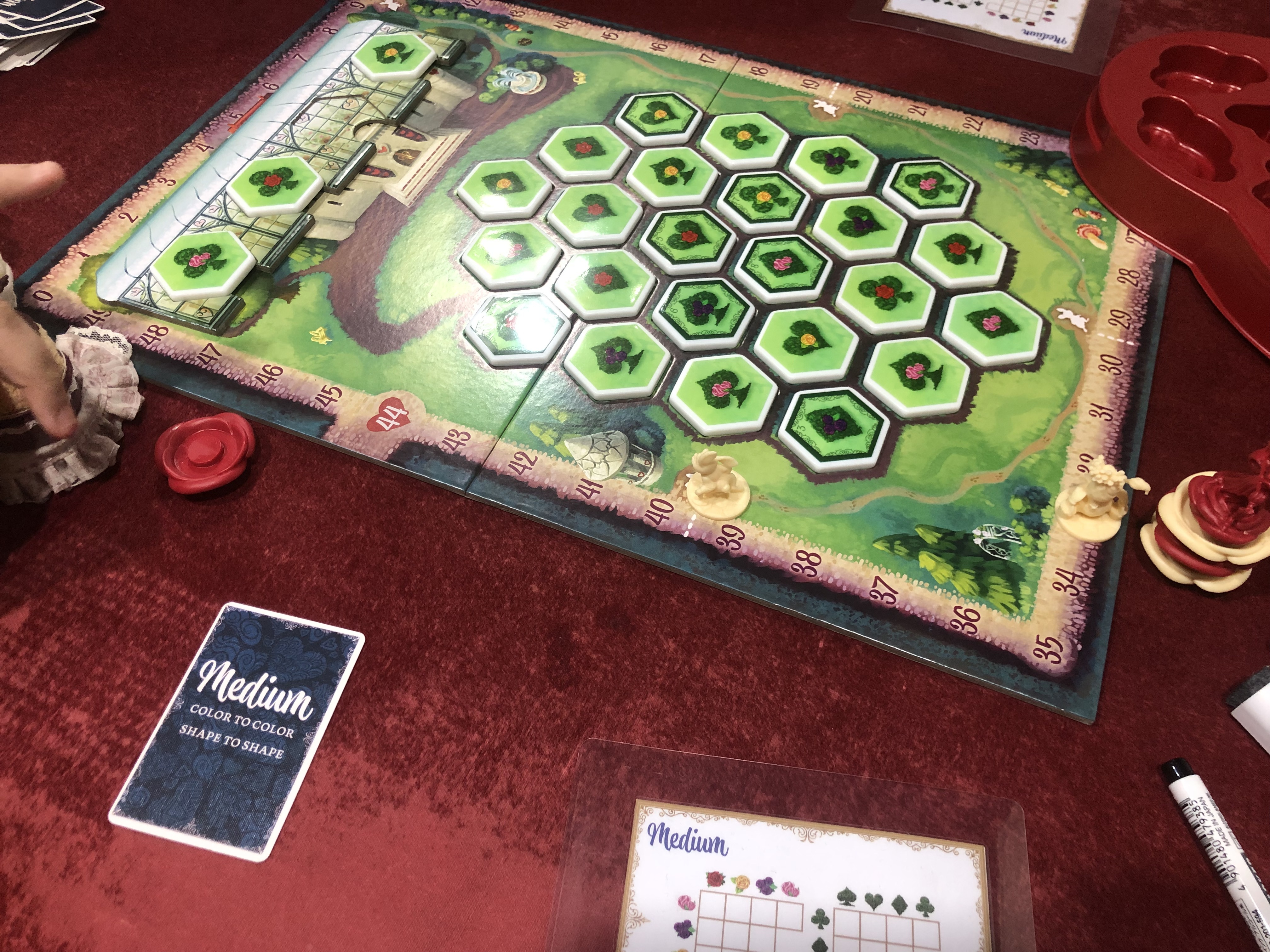 庭に低木タイルを敷き詰めると勝ちになるのですが、ひとつのタイルには色と形という2つの要素を持っていて、配置したタイルと隣接したタイルとの組み合わせのカードを持っていればヒントトークンを合致している数だけ配置していきます。