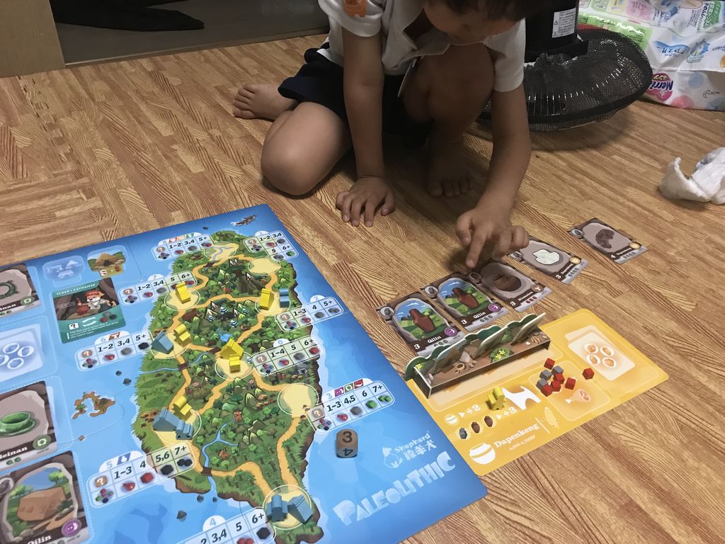 ゲームはざっくり、テーマは台湾の原始時代で、部族の族長として鉱石を掘り、価値ある陶器を獲得していきます。流れは、ダイス振って資源回収して、欲しいもの買ったり建設したりしていく感じです。子供は目の前のやりたいことをやってる手なりプレイ感は否めないですが、すごく楽しんでいました。