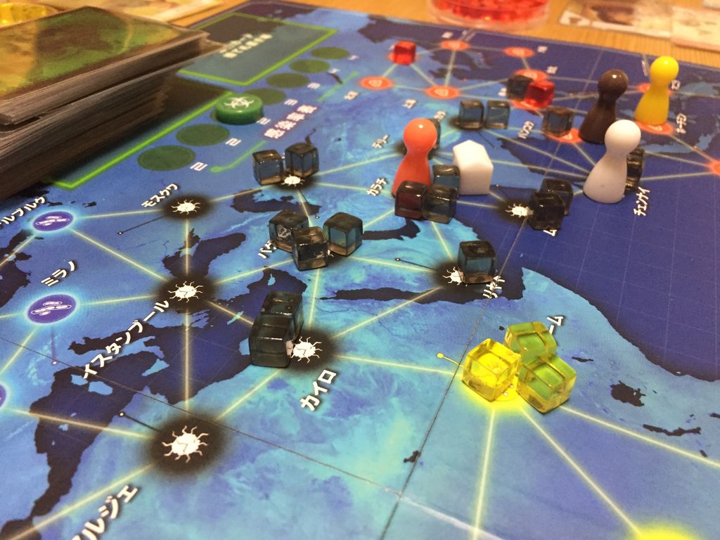 ちなみにプレイしたことのない人向けに説明をしておくと、疫病が広まり始めているところからゲームがスタートし、プレイヤー達は協力してあの手この手で「世界的流行」、すなわちパンデミックを阻止するという協力型ボードゲームの定番です。
