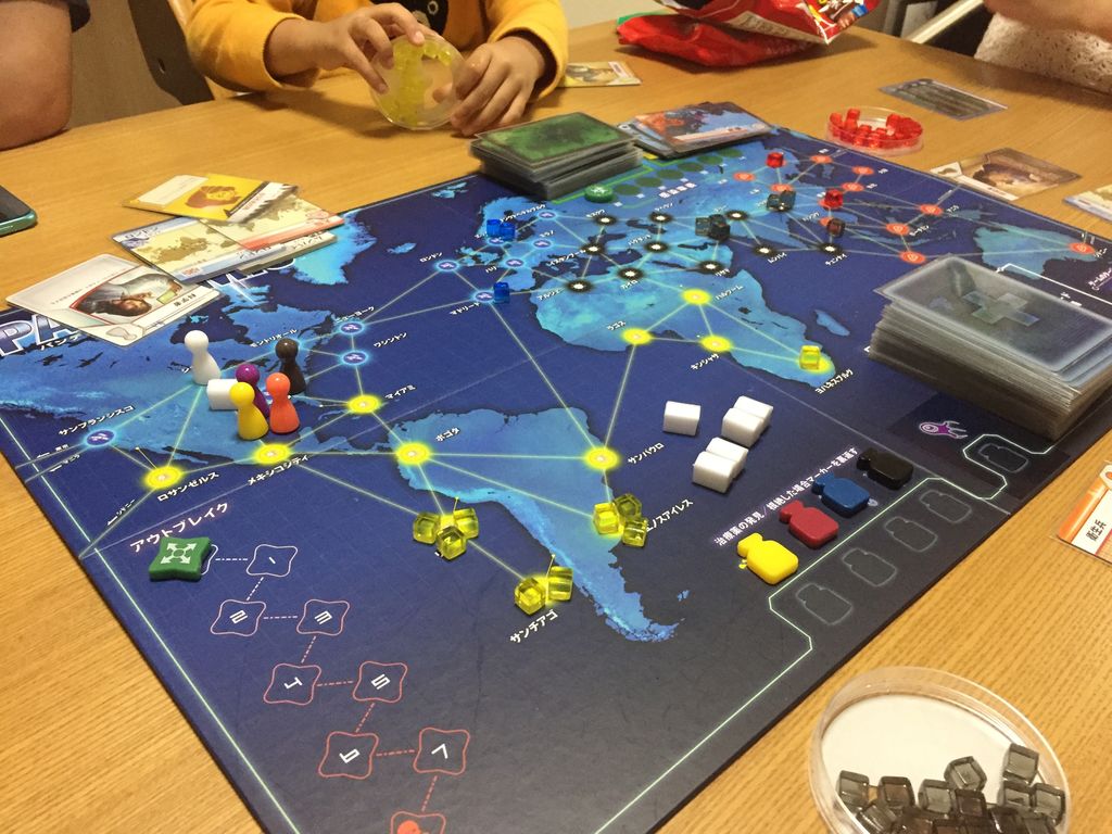 今日は世界を救っちゃうか!ということでたかちゃん持参のパンデミックをプレイ。なんか拡張がいくつか入っているようだった。