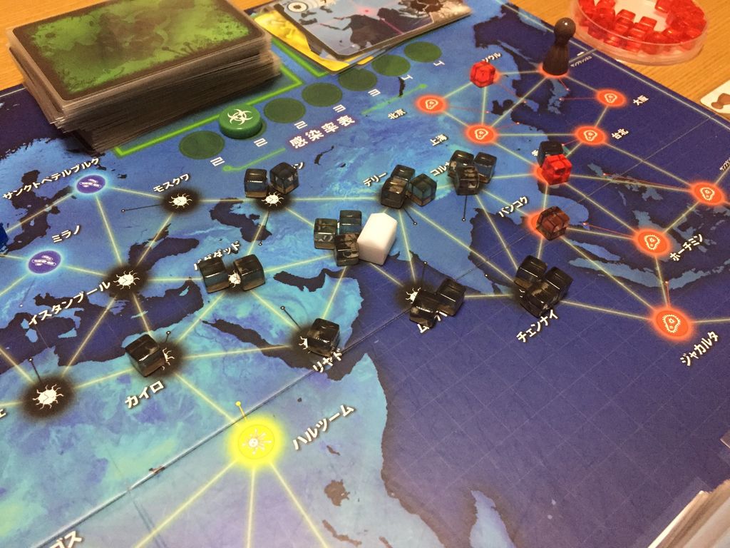 簡単に言ってしまえば、12モンキーズのライリー博士みたいなことをするボードゲーム。ジェームズコール要素はないけど。「疫病が止まらねえ!阻止しなきゃ!ワクチンワクチン!」みたいな。(…12モンキーズのリメイク版が出たらもっと売れるんじゃないか? タイムリープ的な要素も入れて…)