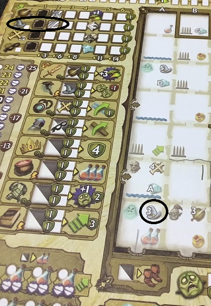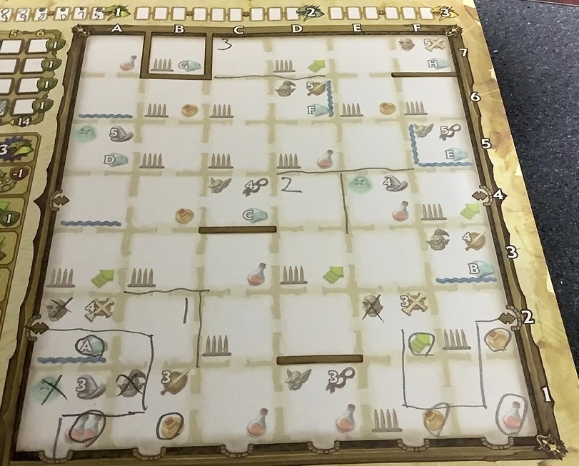 メインの目的であるダンジョン探索ですブーツのマークのあるダイス目だと3歩進めますが、普通のダイス目の場あい2歩になります。