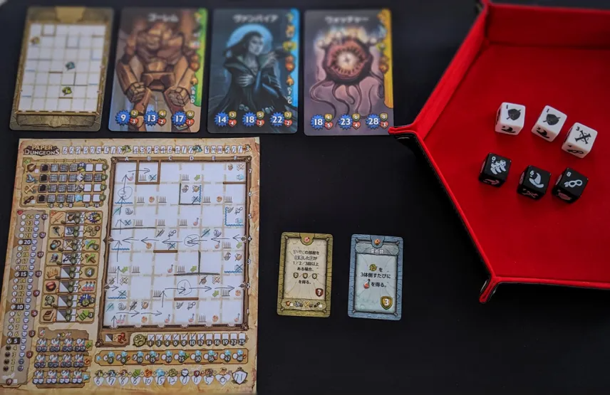 ダンジョンの形状はシナリオで多少変動するものの基本は同一で少々バラエティに欠ける印象があるものの、ダイス目の取捨選択が悩ましく、手ごたえがありつつそこまで重くない中量級にうまくまとまっているのではと感じた。コンポーネントも最小限でプレイスペースがとられないのも好印象。