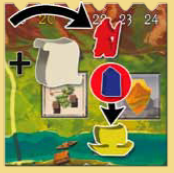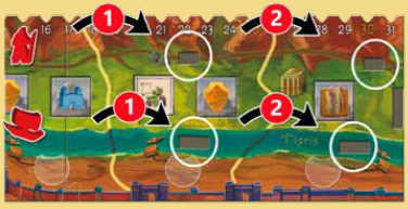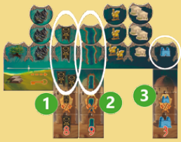 あなたは倍率を取り(1)、パピルスを生産します(2)。一番上のスコアリングタイルがゲームから削除されます(3)。スコアリングタイルを取って使用する場合は、別のスペースから物品を削除する必要があります。 |