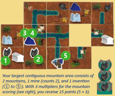- スコアリングタイルを12枚またはそれ以上集めた場合、山スコアリングを行うことができます。 - 連続する最大の河川ネットワークのサイズが12ランドスケープまたはそれ以上である場合は、山スコアリングを実行できます。 |