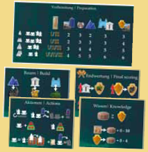 5 x 概要ボード 5つの両面の概要ボードには、ゲーム開始時のプレイヤー数ごとの物品の数と、すべてのスコアリングとアクションが表示されます。 |