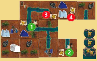 船2隻 + 放浪者2人(3人用ゲームでは船1隻 + 放浪者2人、4人用ゲームでは船1隻 + 放浪者1人)、紋章1つ、知識マーカー1つ、司祭。 |