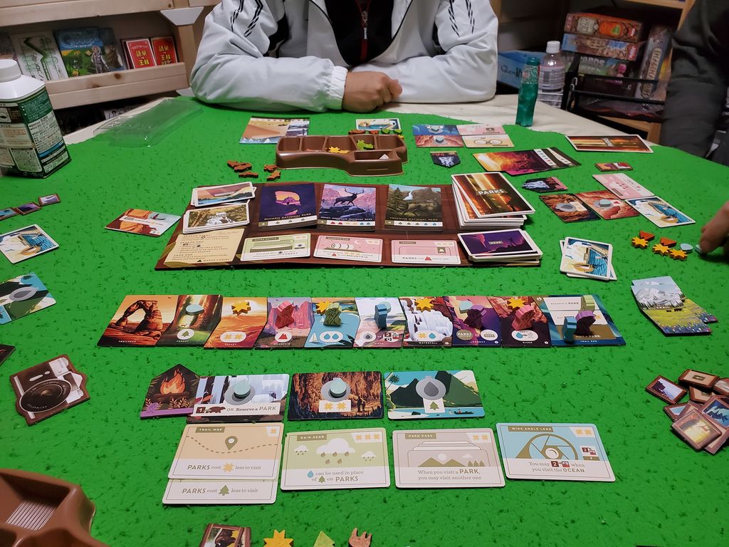 ゲーム性はシンプル。4シーズンあり、各シーズン2人のコマを自分がやりたいアクション(資材を取ったり、特殊効果のある"ギア"を買ったり...)マスまで進めるだけ(後戻りはできず、他の人がいるマスもNG、けど特殊アクションで1シーズンに1回ずつ他のプレイヤーがいるマスに侵入できたり)。なので他人との絡みもあったり。集めたトークンで公園カードを買い集めて、勝利点をたくさん集めたプレイヤーが勝ちです。