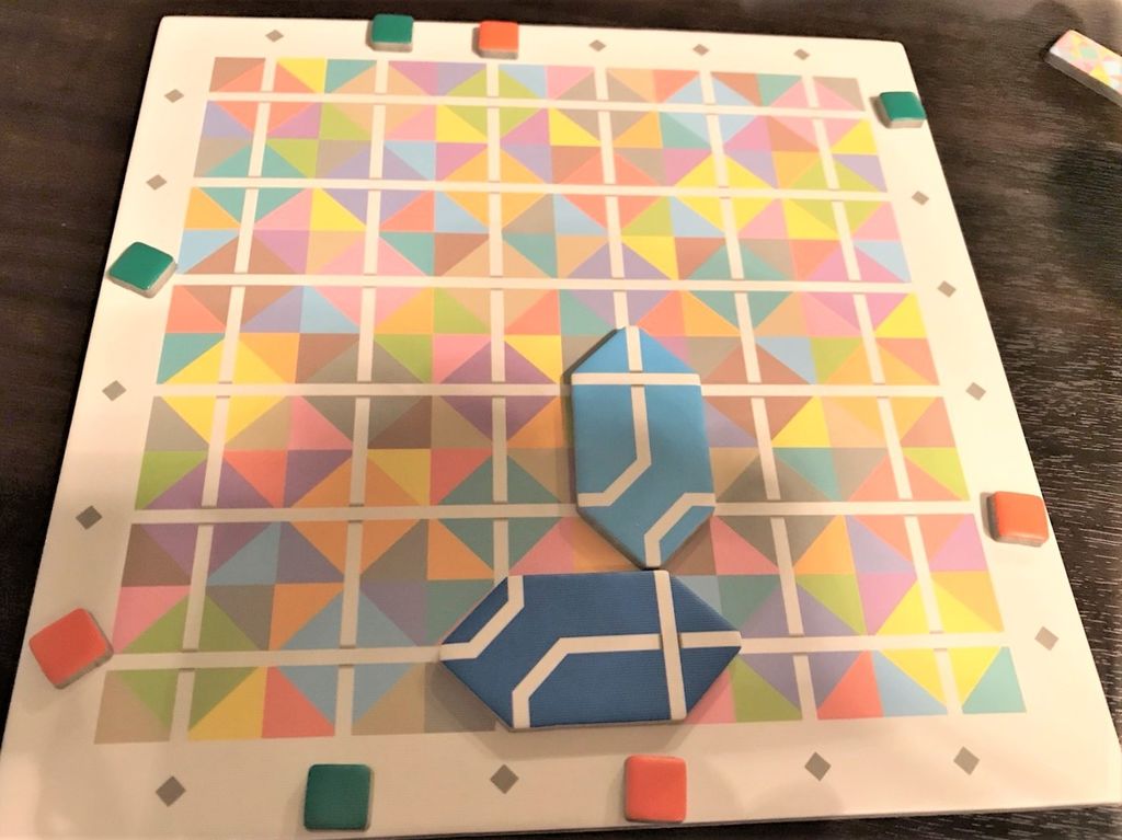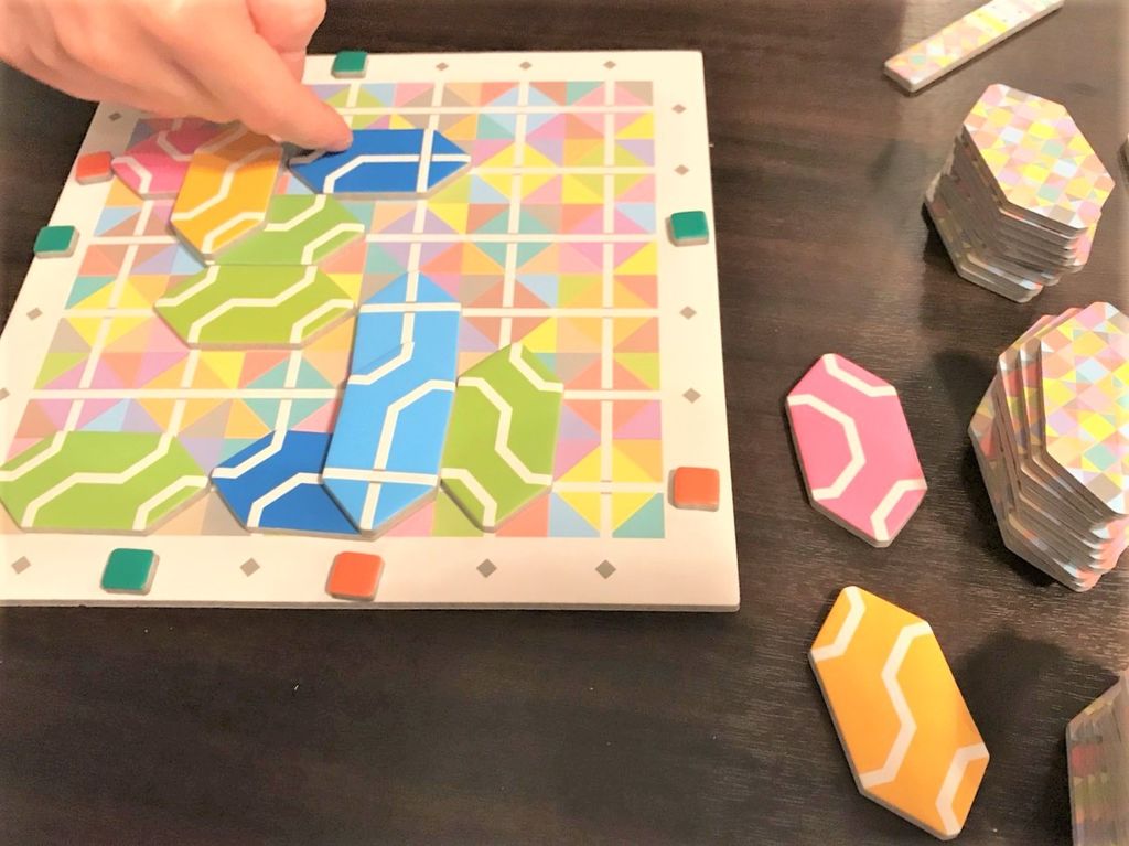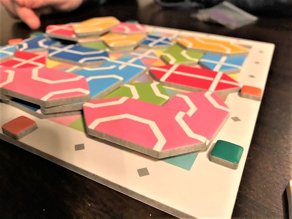タイルは上に重ねることもできて、2つ以上のタイルが下にあれば、上に置くことができます。どんどん進んでいくと、こんな感じの盤面に!