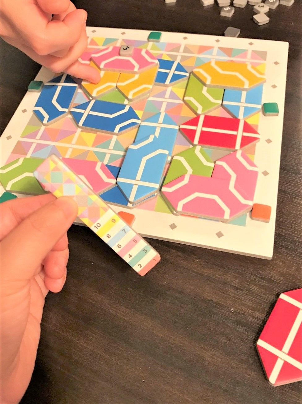 上の写真だと、タイルを置く×2をしました。左と上のオレンジがつながり、タイルが1枚あるので1点。右と下のオレンジがつながり、タイルが2枚あるので2点。そんな感じ!