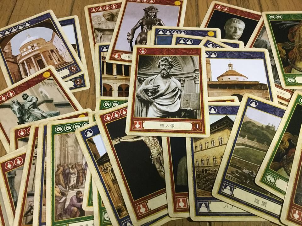 美しい芸術作品のカード,ひんやりしたコイン、柔らかい木の手触り、お金を投げ入れたときの、ヂャリ(ゴ)ン!という音。。。 アナログゲームというのは,目と頭だけではなく、五感(厳密には味覚は除くので四感)をすべて使った遊びなんだな、ということを、実感します。
