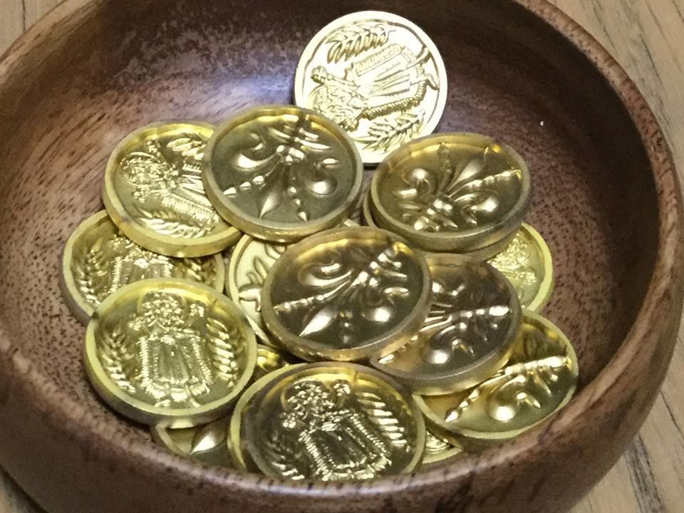 そして、このゲームを通した体験をたいへん特徴的なものにしている、アカシアの木皿と、ずっしりと重い金属のコイン(当時の実在の金貨を模してるようです)です。