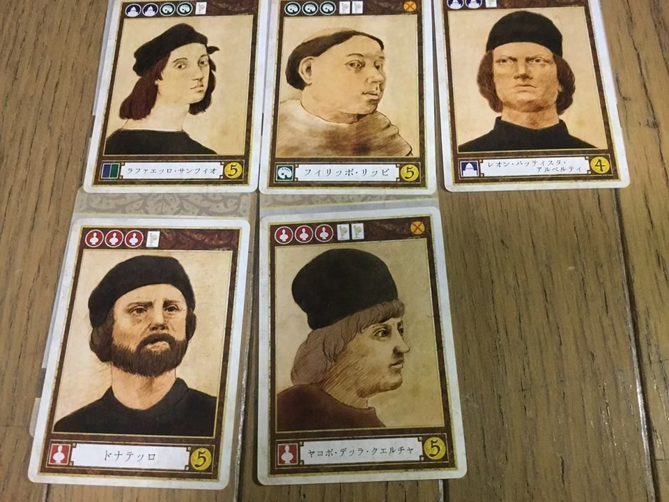 こちらが芸術家のカード(の一部)です。彫刻、建築、絵画の3分野について,得意、不得意をパラメータ(アイコン)で表現された芸術家たちです。こちらもしっかりと考察された,すべて実在の芸術家です。