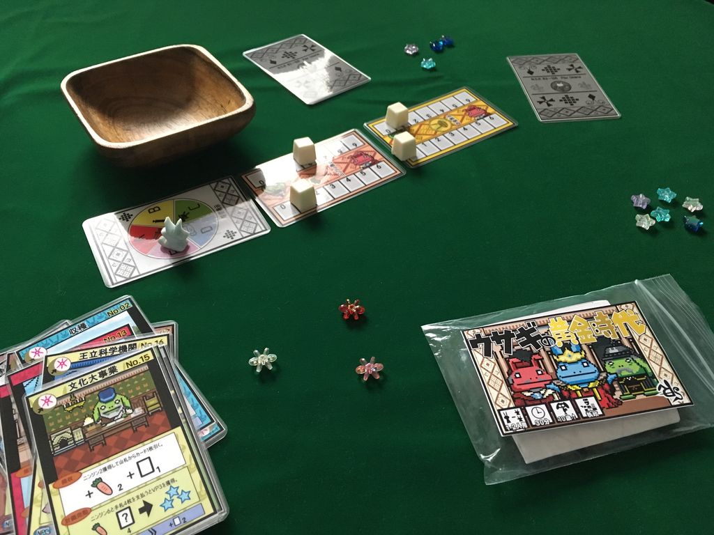 コンポーネントはジップ袋に入っています。ビーズをトークンにしていたりこの手作り感は僕は好きです。カードはすべてラミネートされていて綺麗です。ドットのウサギたちが可愛いです。
