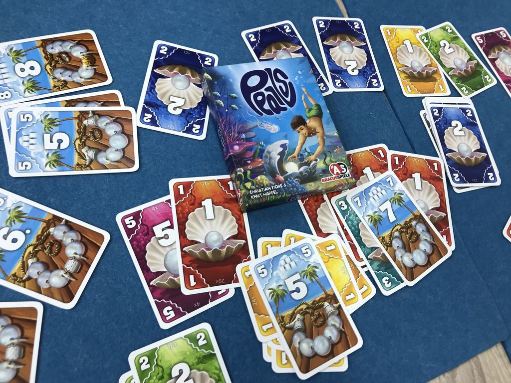 場にある真珠をかき集めて手元でセットコレクションをしていきます。最終的に手元のカードの合計数値で競い合います
