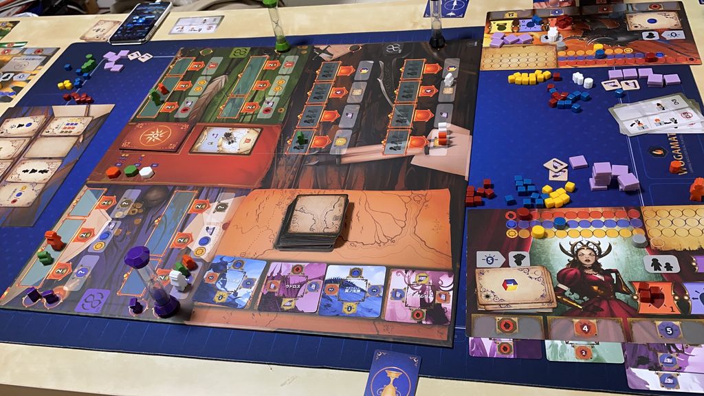 砂時計を使ったリソースマネージメントです。個人の砂時計ではなく共通ですが、他のプレイヤーがコマを置いているとそのアクションができないなどあったりで、素早い判断が求められます。