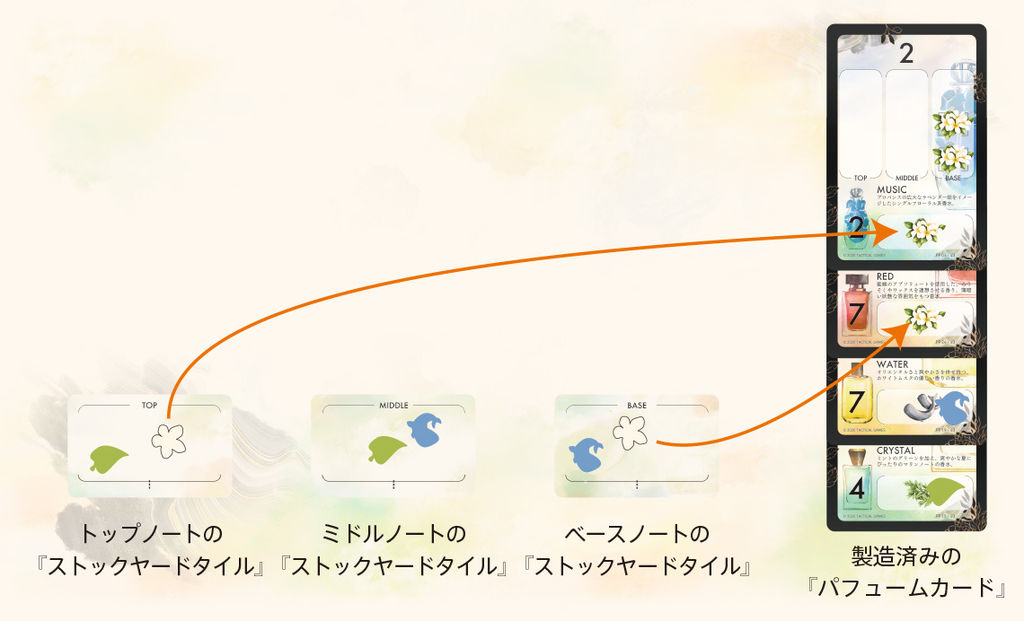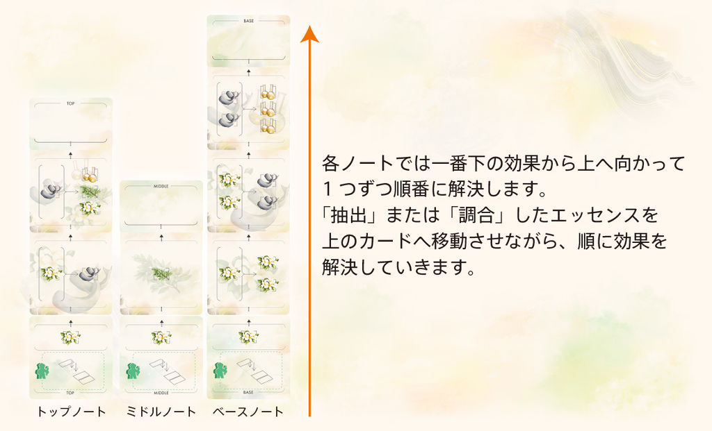 プレイヤーは『調香師駒』を順番に1つずつ、アクションスペースに置いてアクションを実行していきます。それらのアクションを行う事で、手札を得たり自分の「トップ」「ミドル」「ベース」の3つの「ノート」それぞれに『レシピカード』を設置し拡張させていくのです。設置した『レシピカード』によってエッセンスを調香する事が出来る様になっていきます。そうして調香したエッセンスを使い、手札の『パフュームカード』のリストに沿って香水を製造します。それはあなたのブランドにブランド価値をもたらします。