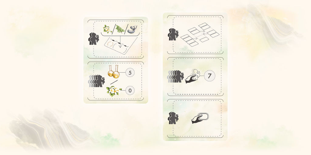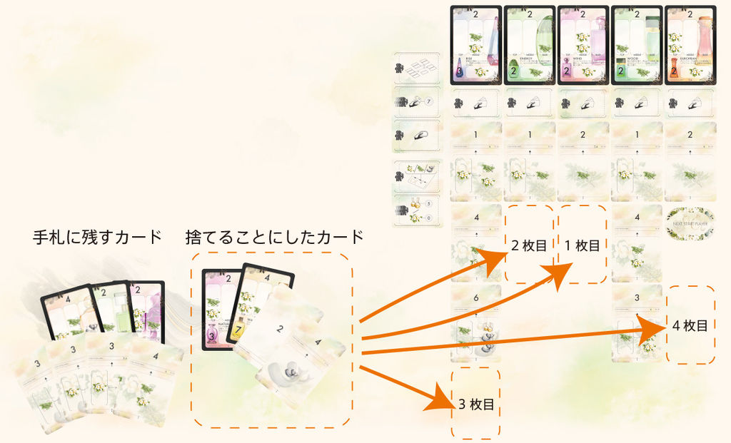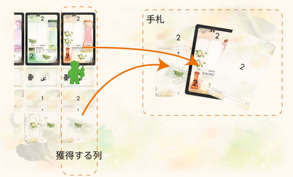 『調香師駒』を置いた『手札獲得タイル』の上下に並ぶカードはすべて同時に獲得できます。獲得したカードは手札に加えます。手札の上限は7枚です。カードを獲得した結果、手札が7枚よりも多いの場合は、7枚になるまで好きなカードを選んで場に捨てます。