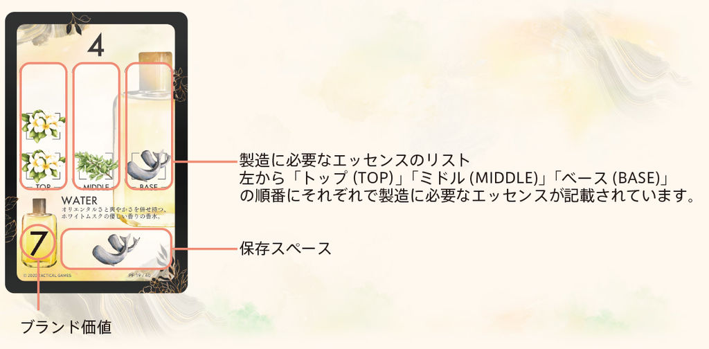 調香フェイズで製造する香水。製造された香水はプレイヤーのブランドにブランド価値をもたらします。「保存スペース」には毎ラウンドで揮発する事のないエッセンスを1つ保存する事が可能です。