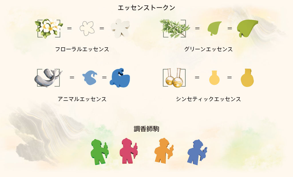 調香フェイズで使用する4種類のエッセンスのトークン。カードに書かれたエッセンスアイコンに対応しています。