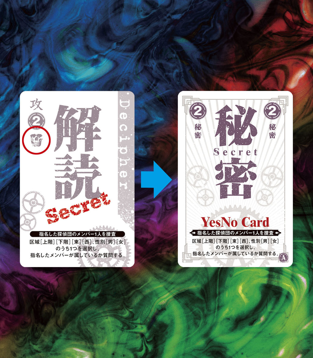 それぞれのカード枚数や、効果に変更がありますが、大きいものでは、影男の正体をズバリ言い当てる『狙撃』が廃止になりました。