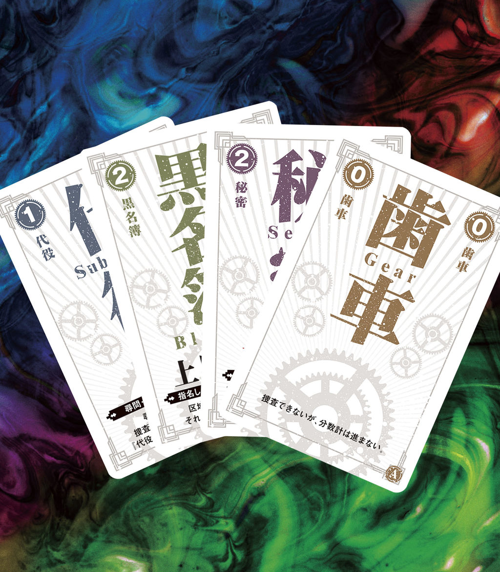 また、YesNoカードで返答する『秘密』と、手番をパスする『歯車』が必ず配布されるので、ゲーム開始の段階で手詰まりになることがなくなりました。